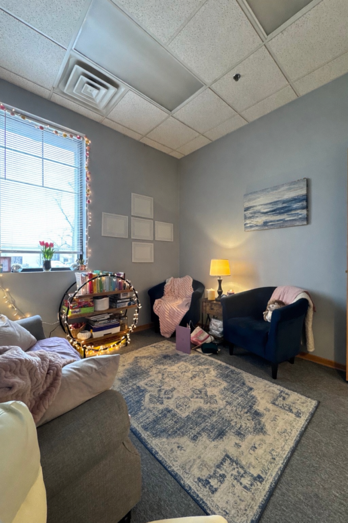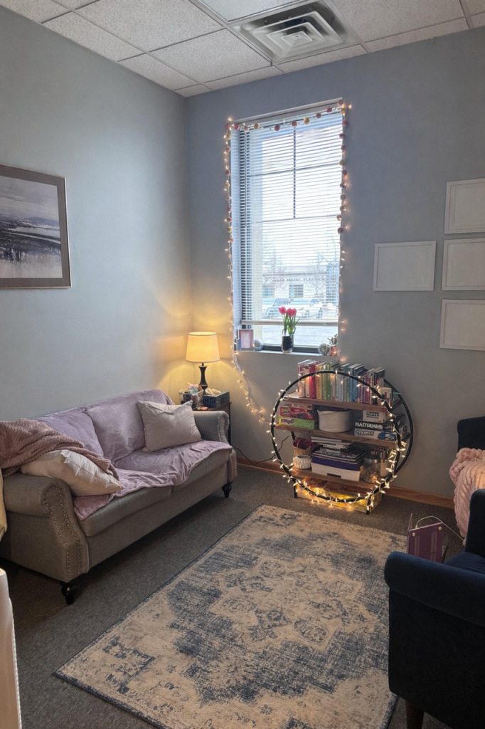 A thoughtfully designed therapy office that replaces clinical sterility with warmth, comfort, and personality. Soft textiles, layered lighting, and approachable furnishings create an environment that feels calm and inviting from the moment you walk in.