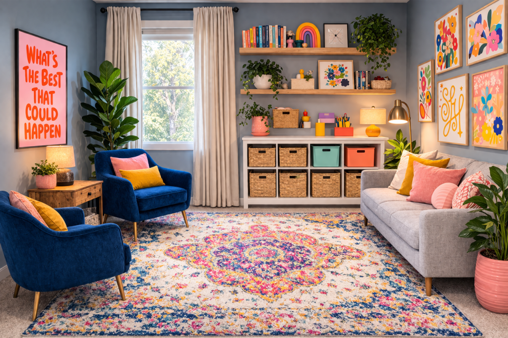 We softened the room by layering in warm lighting, cozy textiles, and approachable furniture. A larger, more vibrant rug helped anchor the space and bring in personality, while comfortable seating created a sense of ease and invitation rather than formality.
