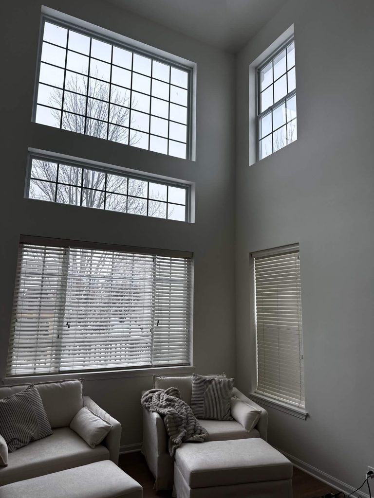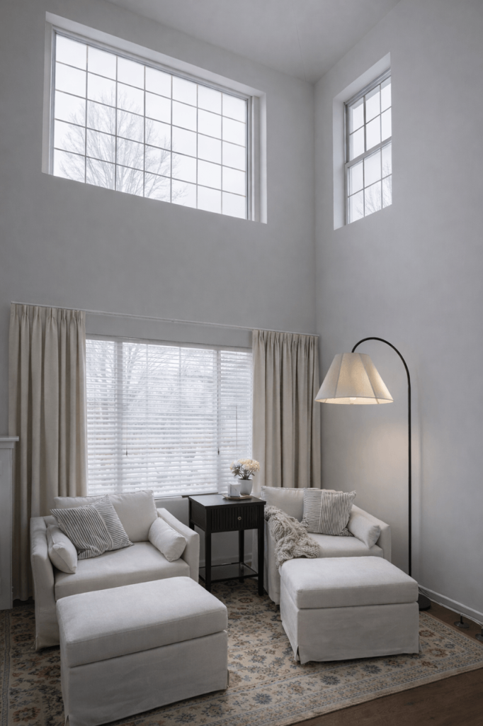 Lower-profile furniture and a grounded layout helped bring the eye down, while full-length drapery emphasized the height in a more intentional, finished way. By layering in warm neutrals and soft textures, the space began to feel less echoey and more livable.