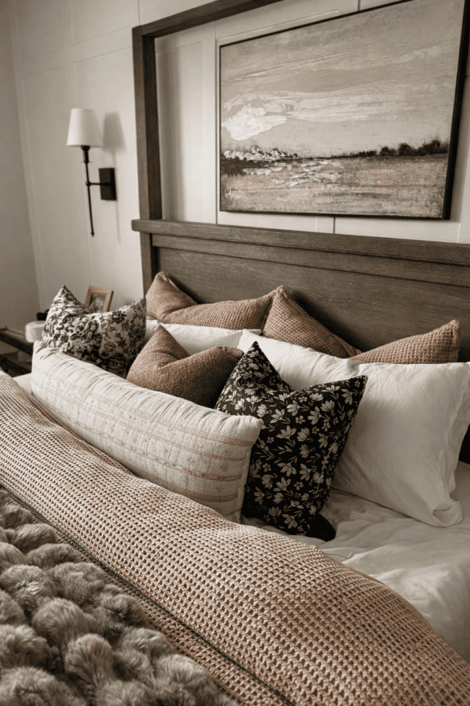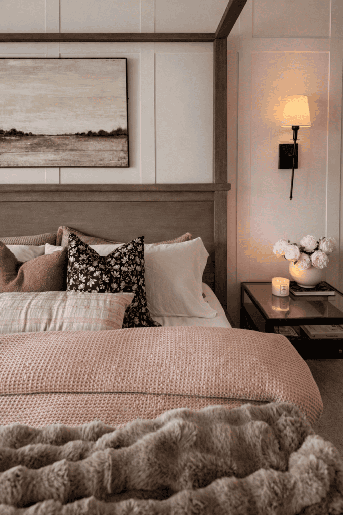 This once builder-grade bedroom was transformed into a calm, layered retreat through intentional structure and warm, organic materials. A custom feeling canopy bed anchors the space, adding architectural presence without overwhelming the room. Soft neutrals, mixed textures, and balanced symmetry create a sense of quiet luxury, while the sitting area at the foot of the bed invites slow, everyday living.